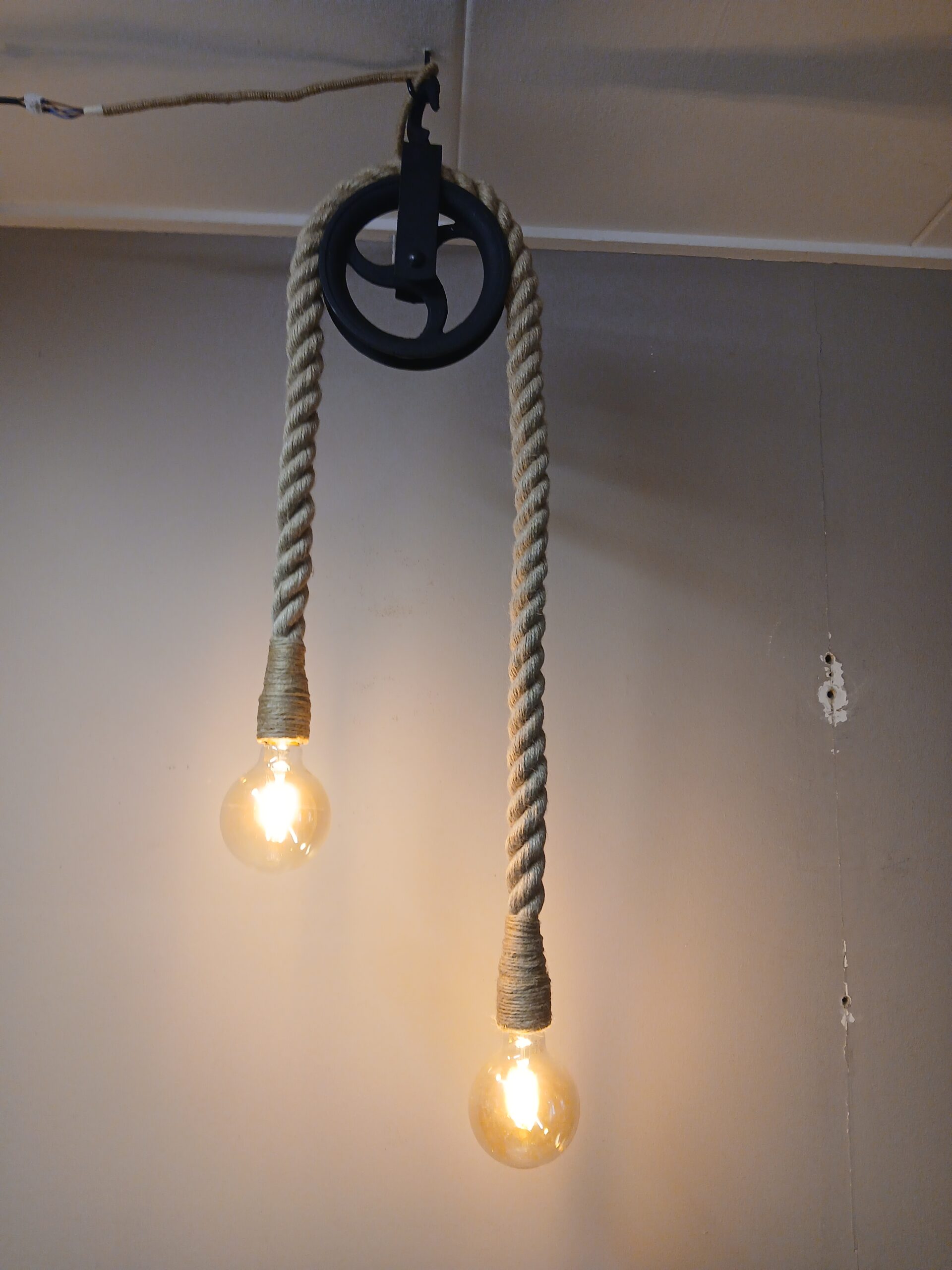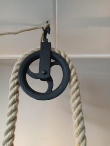 Deze keer eens wat anders. Een industriële katrol met een diameter van 18 cm voorzien van een dik touwsnoer.
