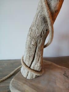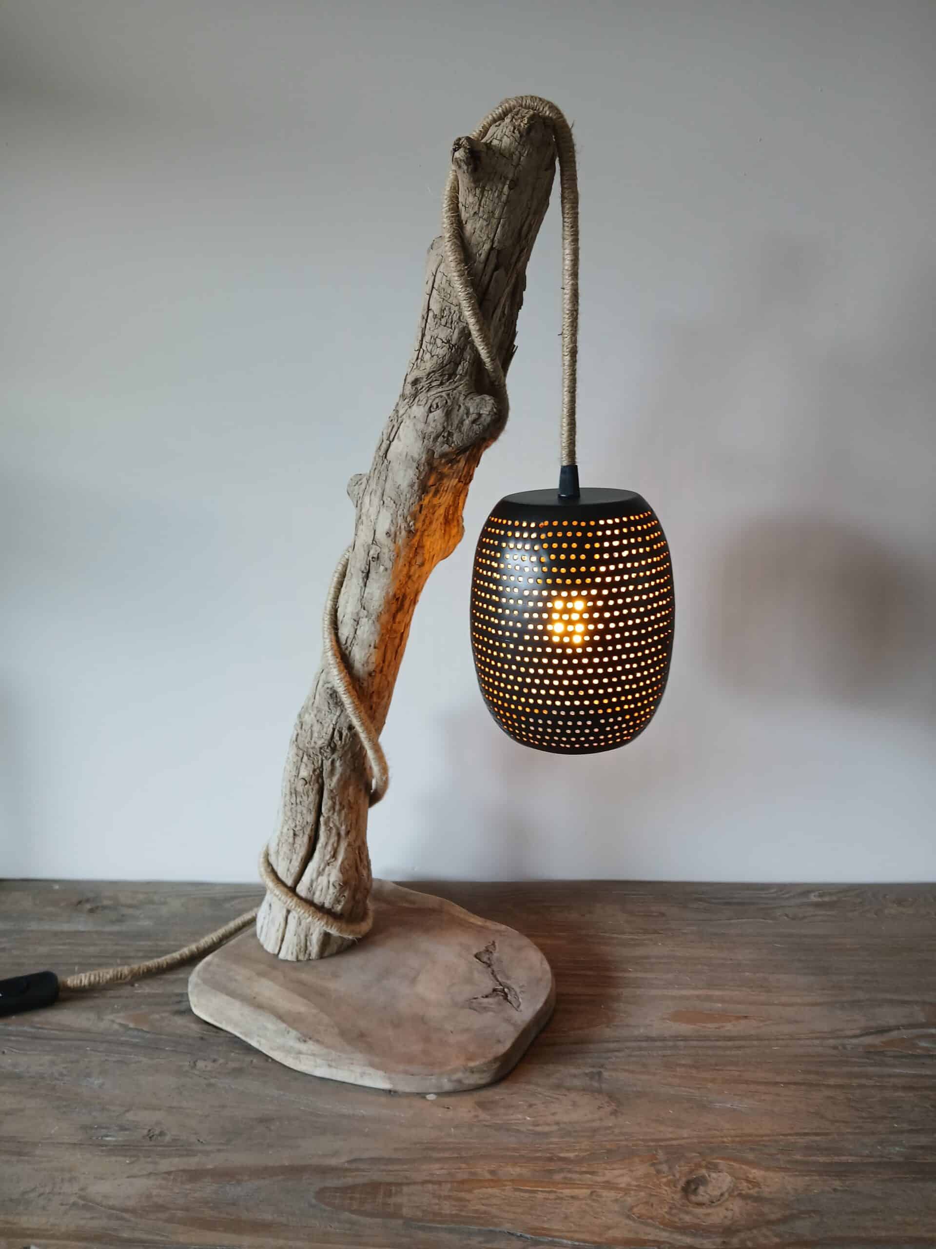 Een leuk robuust landelijk tafellampje van drijfhout uit Oostenrijk. Dit unieke handgemaakte lampje heeft een robuust uiterlijk en is 60 cm hoog.