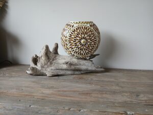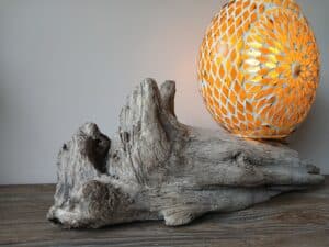 Een leuke tafellamp van drijfhout uit Oostenrijk in de vorm van een slak.