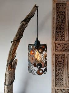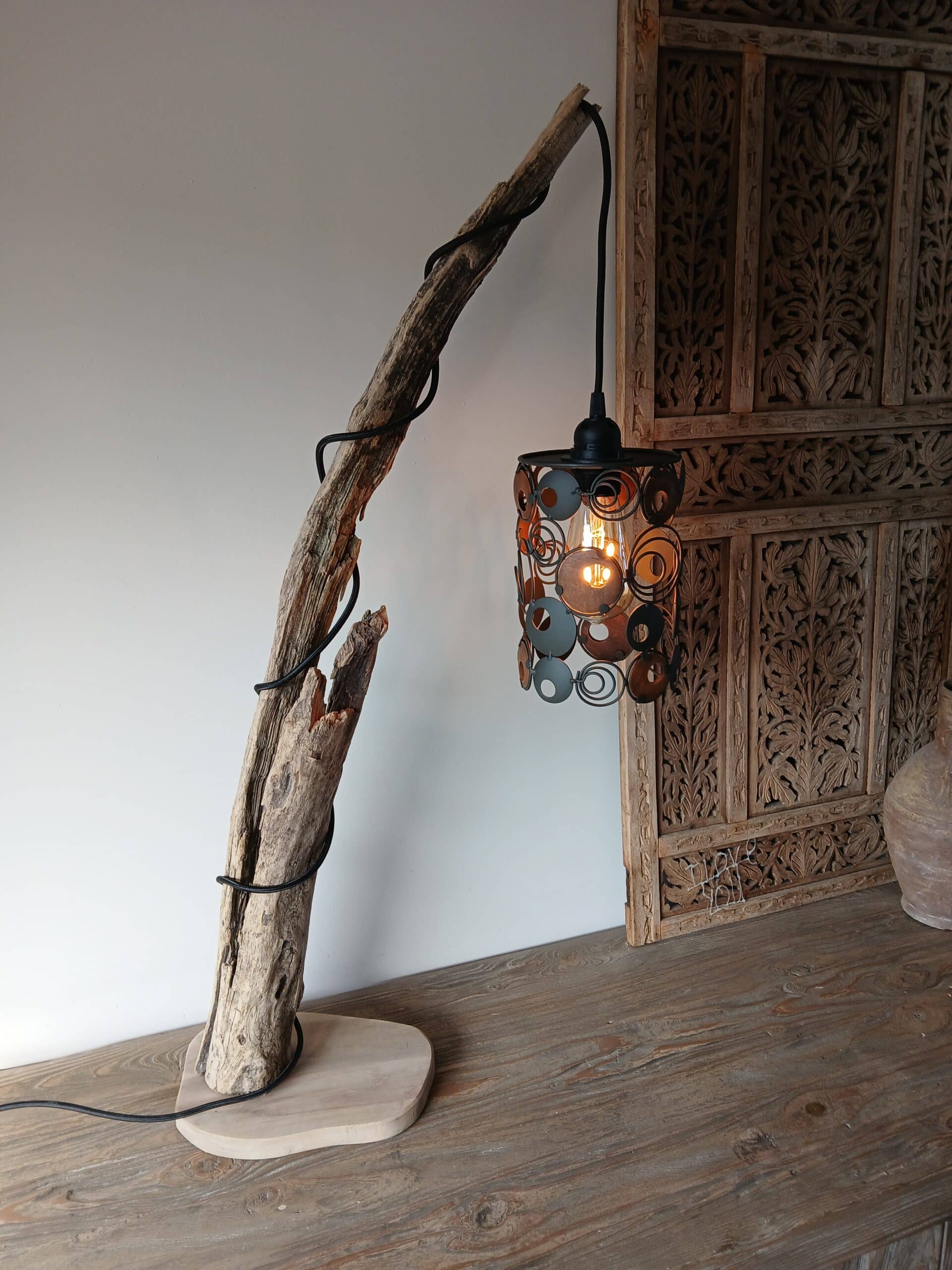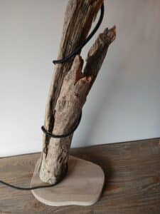 Een landelijke staande tafellamp van drijfhout uit Oostenrijk.