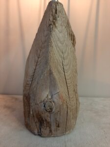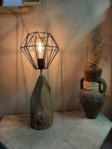 Een leuk tafellampje van drijfhout. De puntvormige voet met het kapje vormen een leuk geheel.