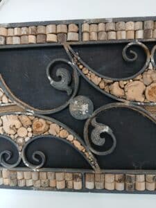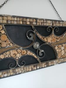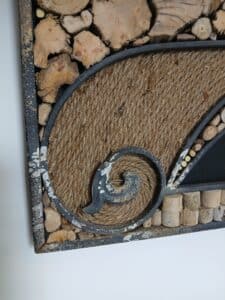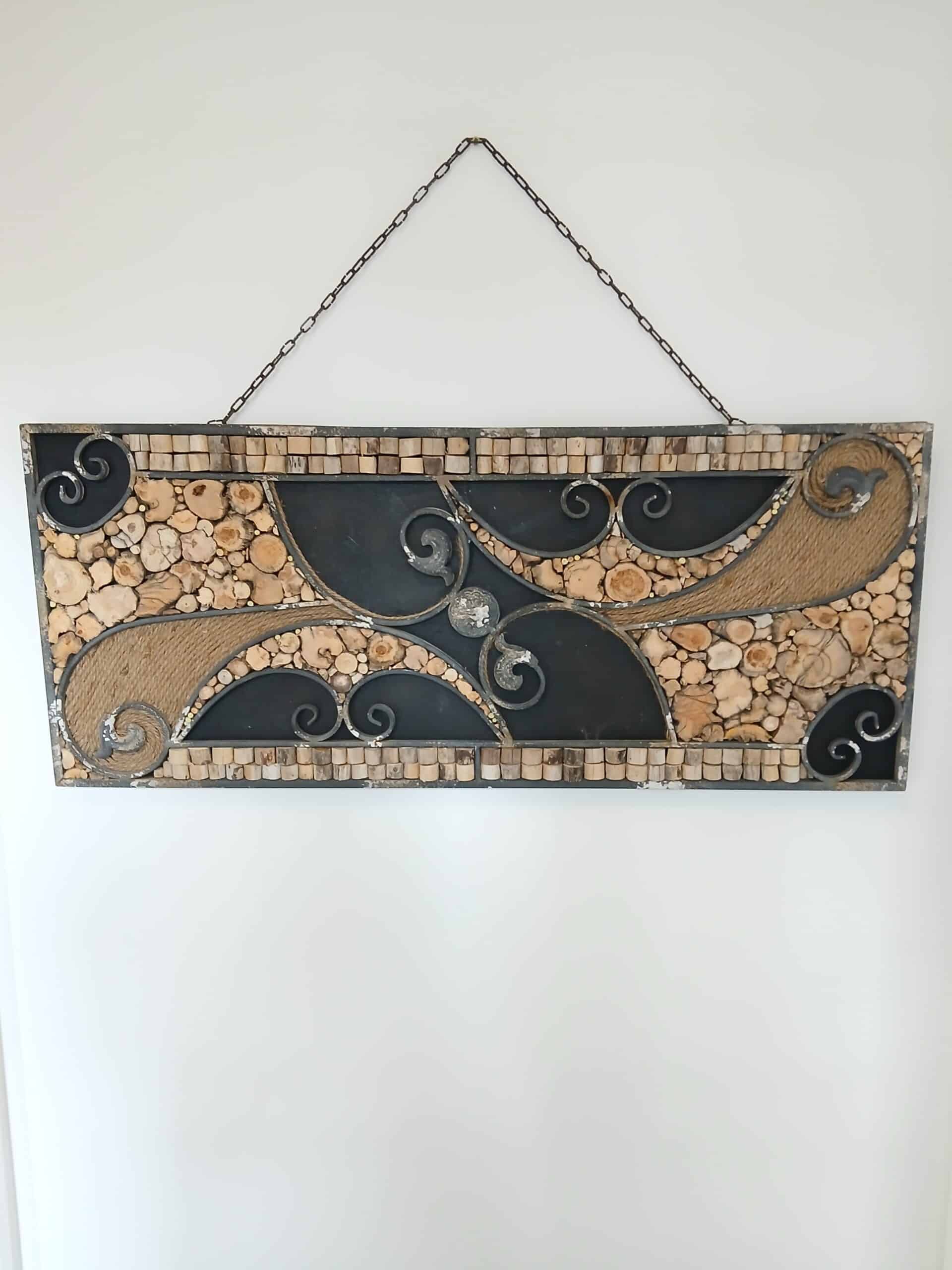 Een stoere landelijke wanddecoratie van schijfjes drijfhout. Het ijzeren frame is gevuld met touw en schijfjes drijfhout.