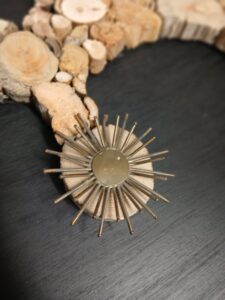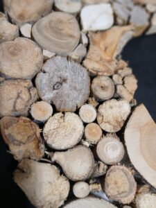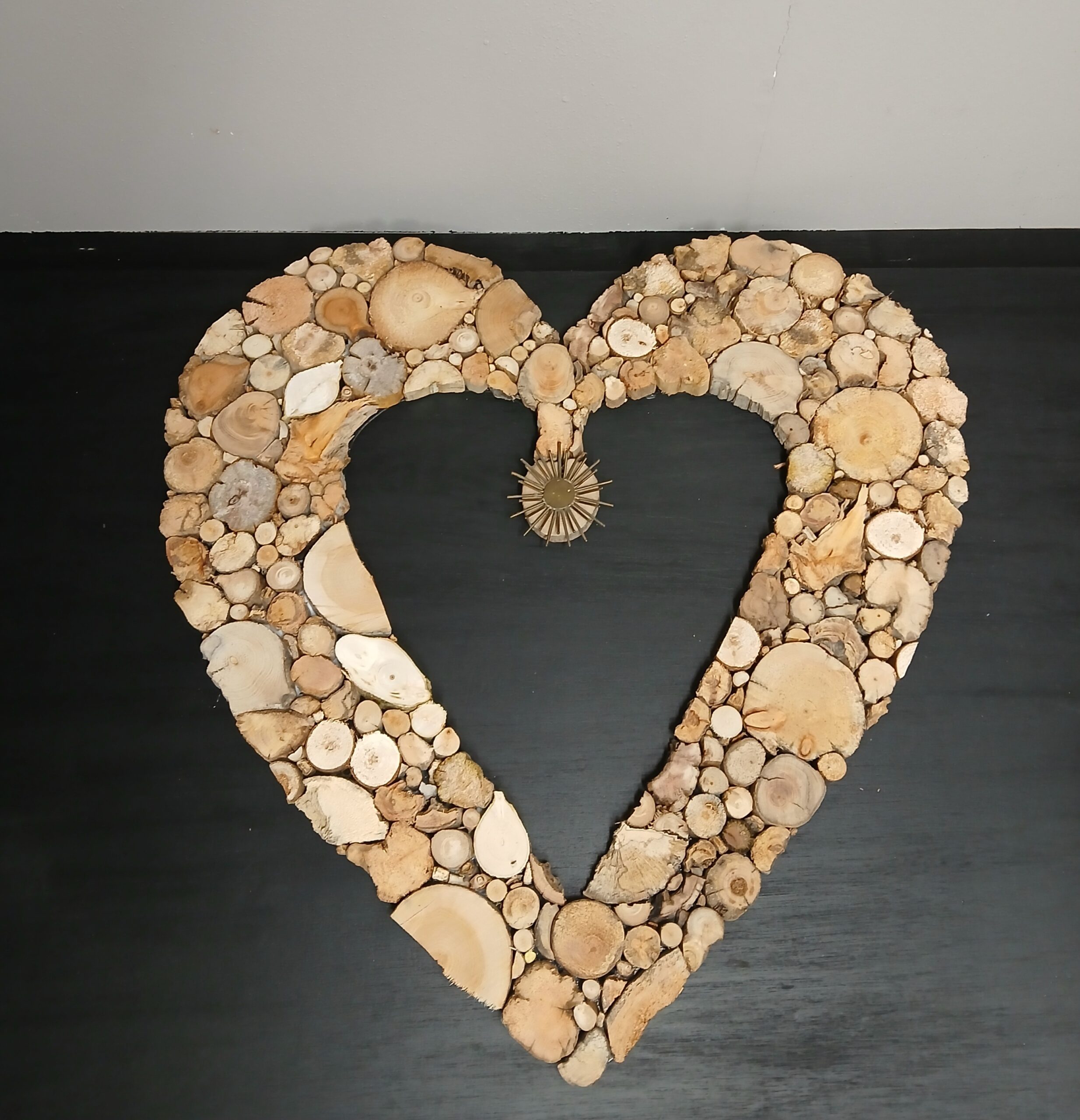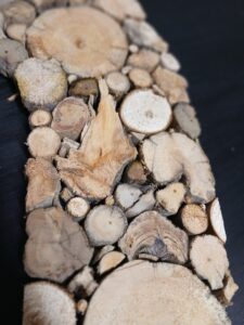 Een unieke en handgemaakte wanddecoratie van schijfjes drijfhout uit Oostenrijk.